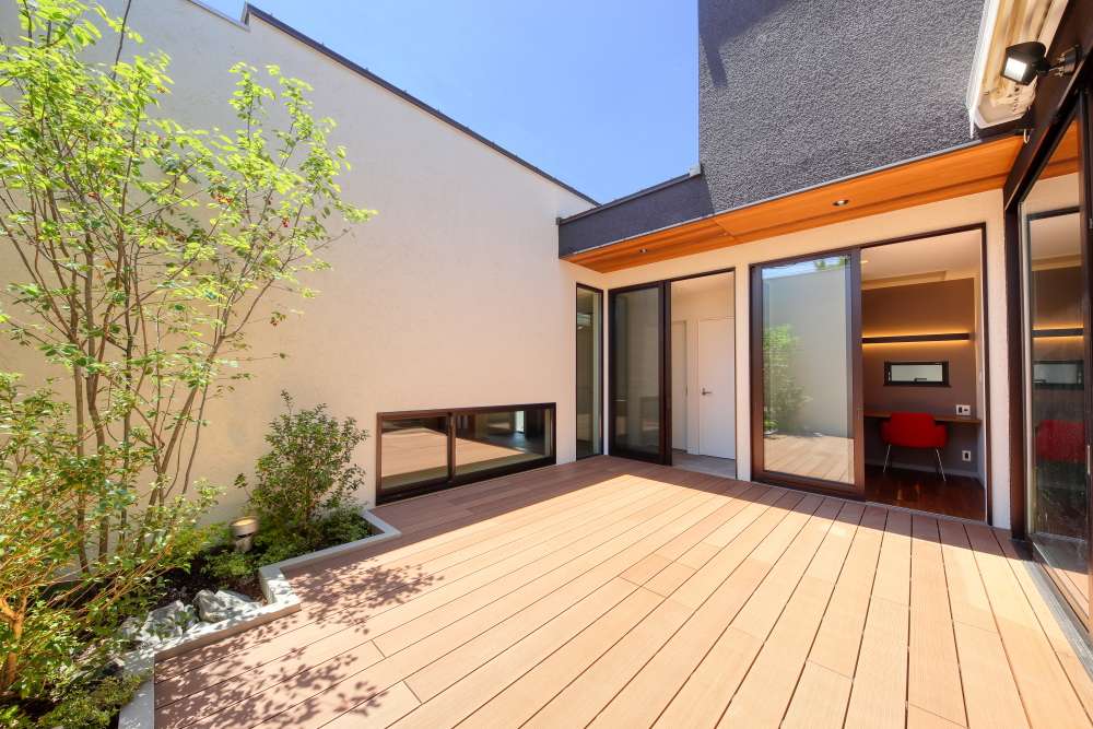 コムハウジングの中庭は、コンクリートのベタ基礎の上にタイルやウッドデッキで仕上げることが多いのですが、仕上げによって排水の考え方が少し変わります。