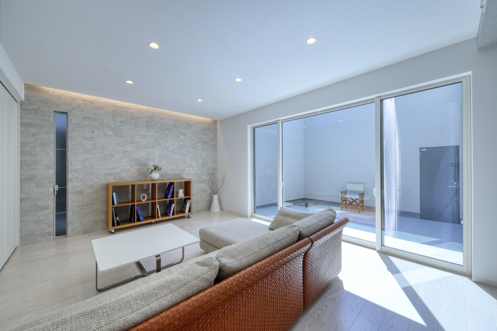 - 外から見られる心配がないのでカーテンは不要で、中庭と室内が一体化し、広く感じるという視覚的効果と共に、式を感じられる家になる。