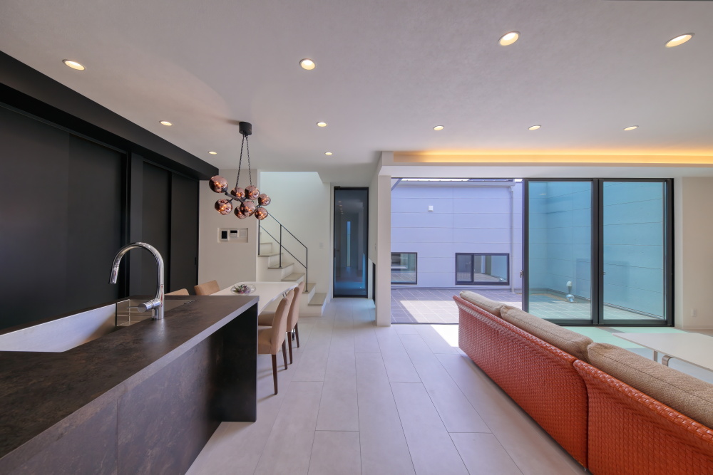 - 明るい床とのコントラストが格好良いブラックカラーのキッチンなど、モダンデザインのインテリア&外観