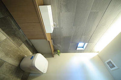 リビングからつながる空間に備えた洗面・トイレコーナーですが、床材を歩行感の良い織物調のビニルシートとし、空間の雰囲気に変化を出しています。