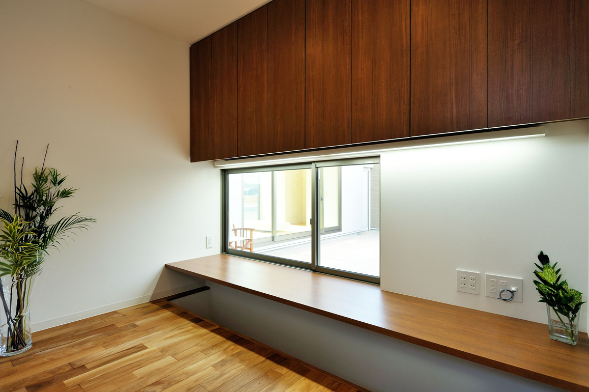 個室にはデスクや飾り棚を備えているので、好きなものを飾って気分良くデスクワークをしたいという趣味の空間です。時にはゴロンと出来るように座卓やソフトクッションに座る設定の低めのデスクです。